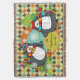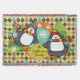 Beautiful Christmas holiday throw blanket features two adorable penguins in ice skates, striped scarves, and winter hats and decorated Christmas trees on a background of brown, cream, aqua, orange, and mustard argyle and an aqua blue centre with white polka dots and snowflakes. You can easily personalise with your family name!