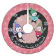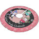 Beautiful Christmas holiday tree skirt features three adorable penguins in ice skates, sweaters, striped scarves, and winter hats on a background of pink and black with snowflakes and polka dots of white and an area you can easily personalise with your family name!