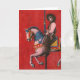 A skeleton cowboy sits on a carousel horse against a bold red background. The horse is adorned with bright blue and yellow decorations, adding a whimsical yet eerie touch to the scene. This artwork has an aged vintage feel.