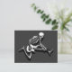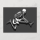 Ink drawing of a skeleton electric guitar player in a big rock leap. B/W, t-shirts, sweatshirts, prints, gifts.