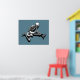 Ink drawing of a skeleton electric guitar player in a big rock leap. B/W, t-shirts, sweatshirts, prints, gifts.