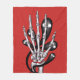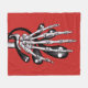 Skeleton hand blanket featuring a graphic illustration of a hand of a skeleton with black spooky ghosts with glowing eyes swirling around it over customisable deep red background.
