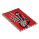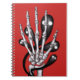 Skeleton hand notebook featuring a graphic illustration of a hand of a skeleton with black spooky ghosts with glowing eyes swirling around it over customisable deep red background.