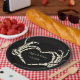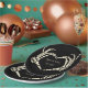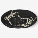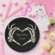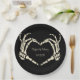Add a creepy, personalised touch to your wedding with these paper plates. These disposable plates are black and feature an illustration of skeleton hands in a heart shape framing the bride and groom's names and wedding date. The graphic and text are in a cream or ivory colour. The macabre style is perfect for October weddings or events with a goth theme.