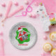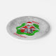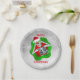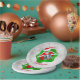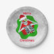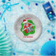 This paper plate has a smiling skeleton holding red and green ornaments with snowflakes up to his eyes wearing a red Santa hat inside a wavy dimensional shape on a white background with circles of various sizes. Customise the Merry Christmas text with the templates.