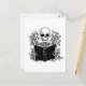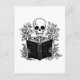 Skeleton reading book postcard for romance readers. Cute skeleton holding a book illustration. Black and white skeleton book flowers aesthetic stationery. Funny book lover gift idea. Gothic bookish postcard.