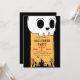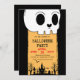 Summon your guests to an unforgettable bash with this spooky Halloween party invitation! Perfect for a haunted house rave, costume party extravaganza, or kid friendly spooky soiree, this design captures the eerie magic of the season featuring a big skeleton skull and a haunted graveyard with fluttering bats at the bottom.