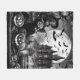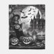 A hauntingly spooky black and white illustration of a skeleton witch with her pumpkins.