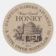 Personalise with your business name, address, and honey weight. Central illustration of a vintage skep hive in a garden surrounded by bees. Ideal for beekeepers and honey sellers. Common honey net weight conversions: 8oz (227g), 12oz (340g), 16oz (454g), 32oz (907g), 5lb (2.27kg).