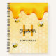 Yellow, white background with a honeycomb pattern. Decorated with sweet, golden dripping honey and happy bumble bees. Templates for your name and monogram letter, and a book title.
