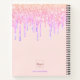 A girly and feminine pink coloured background. Decorated with drips in pink and purple. Personalise and add a name, The title: sketchbook written with a girly modern hand lettered style script with swashes. Purple coloured letters. A notebook for drawings, sketching, notes and school homework.