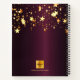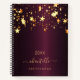 A dark burgundy faux metallic looking background, decorated with faux gold dripping stars. Template for a year. Personalise and add a name and a title. The name is written with a golden modern hand lettered style script with swashes. Can be used as a sketchbook, diary, for journalling, taking notes, to-do lists.