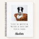 An elegant white background. Personalise and add your own photo of your dog or pet. Add your name and a title. The title is written with a modern hand lettered style script. Black coloured letters. A notebook for sketching your dog, taking notes or for school homework. With a quote: Life is better with a dog by your side.