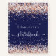 Navy blue background. Rose gold, blush confetti. The title: sketchbook written with a girly modern hand lettered style script with swashes. White coloured letters. A notebook for drawings, sketching, notes and school homework.