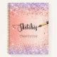 An orange and rose gold gradient background. Decorated with rose gold and violet, purple faux glitter sparkles. Personalise and add a name, The title: sketchbook written with a girly modern hand lettered style script with swashes and a brush. Black coloured letters. A notebook for drawings, sketching, notes and school homework.