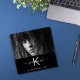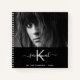 A chic black background. Personalise and add your own photo, a name, monogram letter and a year. The name is written in white with a large modern hand lettered style script with swashes. The monogram letter in grey. For school, work as a sketchbook, diary and journalling. To keep the swashes only delete the sample name, leave the spaces or emoji's in front and after the name