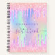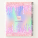 A trendy holographic coloured background with unicorn and rainbow pastel colours in pink, purple, mint green. Decorated with faux drips in pink and purple. Personalise and add a name, The title: sketchbook written with a girly modern hand lettered style script with swashes. Purple coloured letters. A notebook for drawings, sketching, notes and school homework.