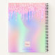 A trendy holographic colored background with unicorn and rainbow pastel colors in pink, purple, mint green. Decorated with pink drips, paint dripping look. Personalize and add a name and monogram letter. The title: Sketchbook is written with large bold block letters. The name is written with a modern hand lettered style script with swashes. To keep the swashes only delete the sample name, leave the spaces or emoji's in front and after the name.