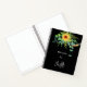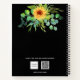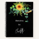 A black background. Decorated with sunflowers, eucalyptus greenery, a paint brush. Personalise and add a title and name. White coloured letters. The name is written with a modern hand lettered signature style script. A notebook for drawings, sketching, notes and school homework.