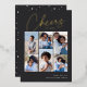 Share cheer with these modern New Year holiday cards featuring 6 of your favourite photos in a grid collage layout. "Cheers to [Year]" appears at the top in gold foil serif and casual hand sketched cursive script. Personalise with your family name at the lower right.