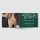 Elegant floral wedding guest book featuring sketched white flowers and leaves near the top of the design with a dark green background. Personalise the botanical wedding guest book with your names and wedding details below. Add custom text to the spine such as your names, wedding date, etc. The back of the floral guest book features your horizontal engagement photo. Designed to coordinate with our Sketched Floral wedding collection.