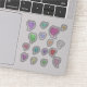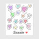 A sheet of stickers featuring a set of hearts in a variety of sizes and colours. Filled with a hand-drawn sketched look.