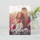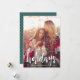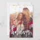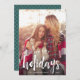Share holiday greetings with these Christmas photo cards featuring your favourite vertical or portrait orientated photo. "Happy Holidays" appears at the bottom as a text overlay in white brush lettered typography. Personalise with your family name or names beneath. Cards reverse to spruce green with a subtle white dotted pattern.