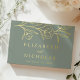 Elegant floral wedding guest book featuring sketched gold foil flowers and leaves near the top of the design with a dark sage green background. Personalise the foil wedding guest book with your names and wedding details below. Add custom text to the spine such as your names, wedding date, etc. The back of the floral guest book features your horizontal engagement photo. Designed to coordinate with our Sketched Floral wedding collection.