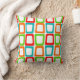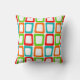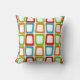 This throw pillow has a mid-century modern design of repeating skewed rectangles in red, orange, green, and turquoise.