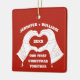 On the front of this Christmas ornament add your names, the year and your own custom message, and on the back add a favourite photo to create your own custom holiday decoration. The front also features a pair of ski gloves with the hands in a heart shape in white against a festive red background.