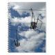 Two empty ski lift chairs hang from their lift cables in this striking photograph. With no riders, the ski lift looks like a black linear diagram in front of an expansive view of blue sky and white puffy clouds. The upper right chair heads uphill and the lower left chair returns downhill.