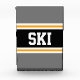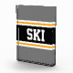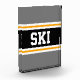 This sporty, athletic design features bold SKI text inside a highlighted wide black stripe with double white and yellow racing stripes against grey outer stripes. The text can be personalised.