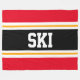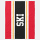 This sporty, athletic design features bold SKI text inside a highlighted wide black stripe with double white and yellow racing stripes against bright red outer stripes. The text can be personalised.