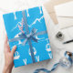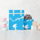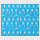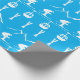 Winter sports blue gift wrap featuring skiers, cable cars, skis and mountain ranges