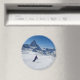 Round photo magnet with a female skier skiing on the slopes of Matterhorn mountain through fresh snow on a beautiful day with a clear blue sky in ski resort Zermatt, canton Valais in Switzerland.