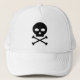 Trucker hat featuring a design containing the simple drawing of a skull and crossing bones. The colour of both the fill and strokes (borders) of the skull and bones, as well as the size, can be changed to your preference in the "Edit this design" section.