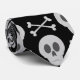 This necktie has a Halloween design of skulls and crossbones repeating across the design.
