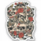 A macabre yet beautiful illustration featuring a cluster of skulls adorned with vibrant red roses, delicate butterflies, and whimsical mushrooms. The skulls, each with unique expressions and details, are entangled in a tangle of vines and leaves, creating a sense of both chaos and order. Birds perch on branches and skulls, adding a touch of life to the otherwise morbid scene. The overall aesthetic is dark and gothic, yet also carries a hint of whimsy and romance.