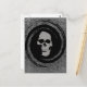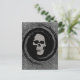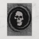 A lone grey skull sits in a swirling black void on a static looking grey background.