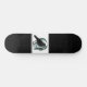 An illustrated gothic skull, raven and skeleton key on black skateboard.