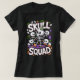 Join the "Skull Squad" with this lively and fun Halloween design! A group of adorable, animated skeletons is front and centre, ready to celebrate. The lead skeleton is giving a peace sign, wearing a party hat, and rocking some stylish kicks, surrounded by more skulls, ghosts, pumpkins, and candies. A purple broom adds a witchy touch to the scene, while the bold lettering of "Skull Squad" brings a playful energy. Perfect for anyone who loves Halloween, this design blends spooky with cute, making it a great pick for apparel, posters, or party decor.