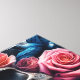 Intricate artwork featuring a beautifully detailed skull adorned with roses, feathers, and a vibrant bluebird, symbolising the contrast between life, death, beauty, and transformation in an elegant artistic arrangement.