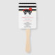 Skulls and black, white stripes red wedding program hand fan. It displays a skull couple. The bride wears a red bow and the groom a red hat. On the upper part there is a striped black and white border.