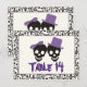 Elegant skulls Halloween purple black wedding Table number postcard, featuring a black skull couple bride and groom on ivory background and a skull pattern border. The groom wears a purple hat and the bride a purple bow.