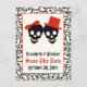 Elegant skulls Halloween red black wedding Save the Date postcard, featuring a black skull couple bride and groom on ivory background and a skull pattern border. The groom wears a red hat and the bride a red bow.