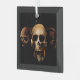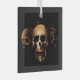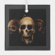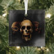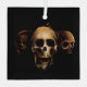 Three human skulls against a backdrop of black, A little critter is peeking over the middle skull