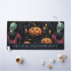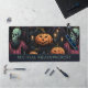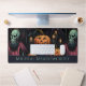 A funky skulls and pumpkin Patterned desk mat. A great gothic spooky design that features orange pumpkins, blue skulls and large candles all on a black and purple background. A great way to add a stylish splash of moody goth to your desk work space. Add a name for a unique gift.