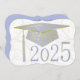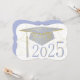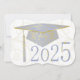 Floral designs on graduation cap, background and year. Sky blue graduation cap on a white background. The back has a sky blue background with gold lettering for the graduation party invitations.