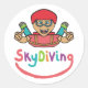 A fun Skydiving design shows a skydiver with helmet, goggles, thumbs up and legs splayed out behind. Falling through the air waiting for the right moment to deploy the parachute. The word "Skydiving" underneath with the "g" turning into a big smile.