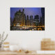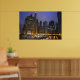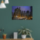 A look down the Chicago River at dusk with the tall buildings shooting up and lighting up the night.